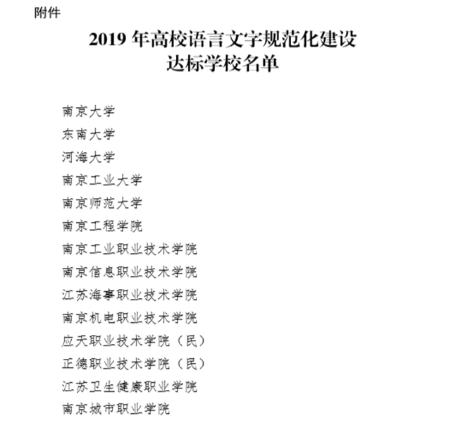2019年1月8日,江苏省教育厅 江苏省语言文字工作委员会发布《关于公布2019年高校语言文字规范化建设达标认定结果的通知》(苏语函〔2020〕1号),经学校申报、专家评审、网上公示,认定48所高校语言文字工作规范化建设达标。