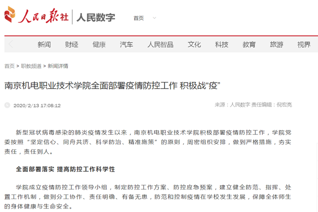 2月13日,人民日报职教频道刊登了我院积极部署疫情防控工作的专题报道。