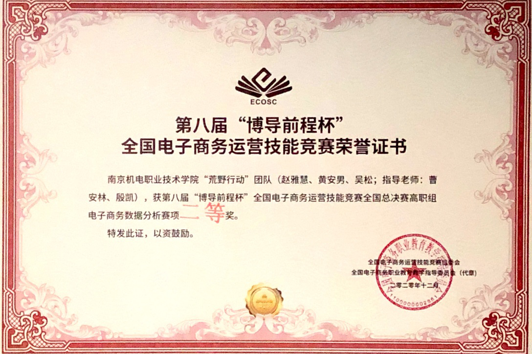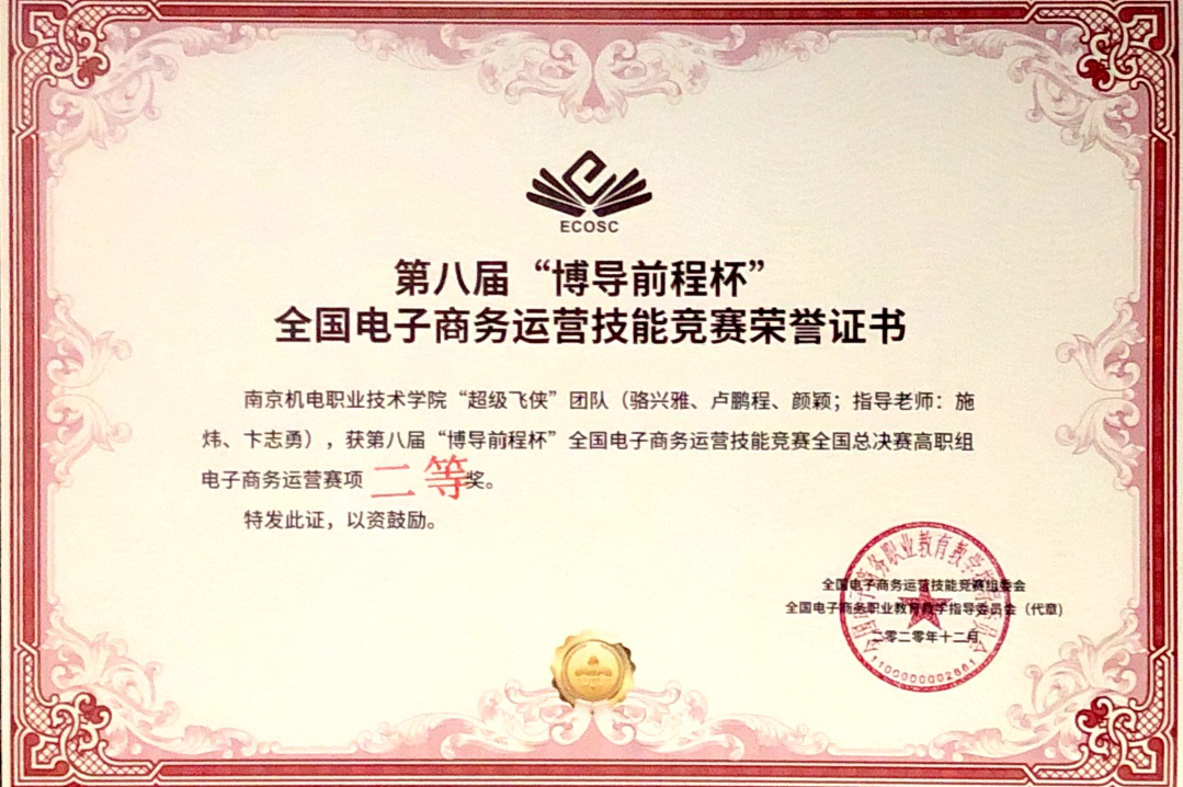 2020年12月29日,第八届“博导前程杯”全国电子商务运营竞赛决赛在苏州经贸职业技术学院举行。中欧集团官网(中国)官方网站电子商务运营“超级飞侠队”团队(骆兴雅、卢鹏程、颜颖;指导老师:施炜、陈洁)以及电子商务数据分析“荒野行动队”团队(赵雅慧、吴松、黄安男;指导老师:殷凯、曹安林)双双荣获高职组全国总决赛二等奖。