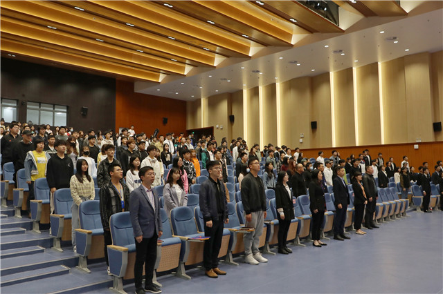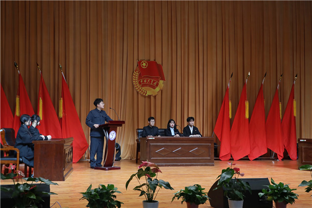 表彰大会在雄壮的《中华人民共和国国歌》歌声拉开帷幕。今年是中国共产党成立100周年,100年风雨兼程,100年奋斗不息,在中国共产党的坚强领导下,中华民族不仅实现了从站起来、富起来到强起来的伟大飞跃,更是在实践中不断丰富完善着中国特色社会主义理论体系,为中国共产党源源不断提供着思想动力和智慧源泉。全体团员在学生团委副书记孙佳怡的带领下重温了入团誓词。
