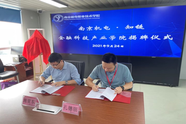 签约及揭牌仪式上,双方代表签订了校企合作协议,共同揭开了“南京机电•知链金融科技产业学院”的挂牌。揭牌仪式后,各企业专家、校领导就产业联盟建设、产业学院建设的创新思路,产业学院人才培养的新模式等展开交流研讨会。