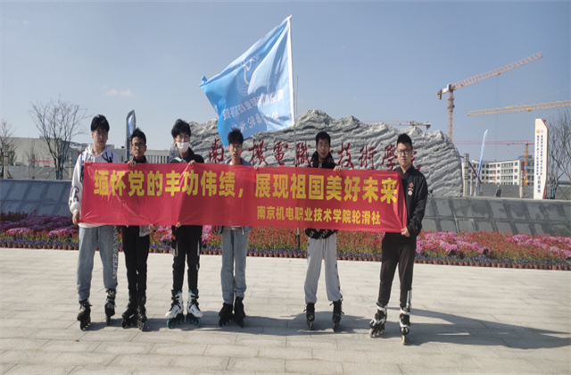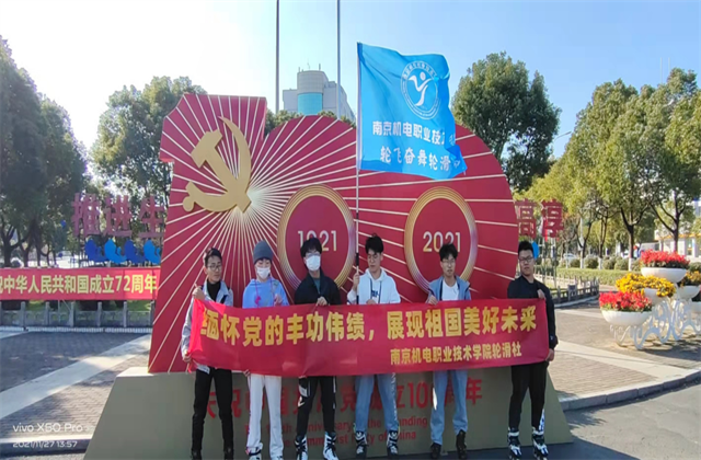 本次活动先是从学校出发,轮滑到团结圩地铁站,坐地铁抵达高淳区,在高淳区落点。社长组织成员们进行打卡。活动过程中,社长手举印有南京机电轮滑社旗帜,带领社团成员排成一列,匀速滑往各个打卡点。一路上,成员们欢声笑语,兴致昂扬,没有抱怨。在阳光的照耀下,在马路的一边形成了一支鲜明的队伍。活动打卡了七个地点,有:湖滨广场、人民广场、高淳老街、福克斯广场……每一个驻足的地方都有着“庆祝建党百年”的标志。