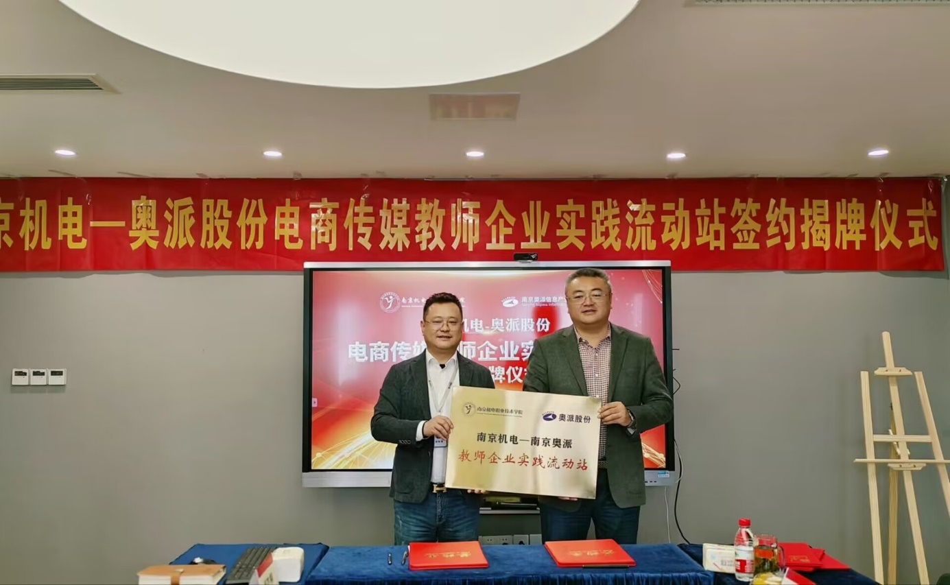 签约授牌仪式上,刁爱军与徐林海共同签署“南京机电-奥派股份电商传媒教师企业实践流动站”校企合作协议,共同揭牌“南京机电-奥派股份电商传媒教师企业实践流动站”。信息工程系主任王玮为教师企业实践流动站的企业导师颁发聘书。