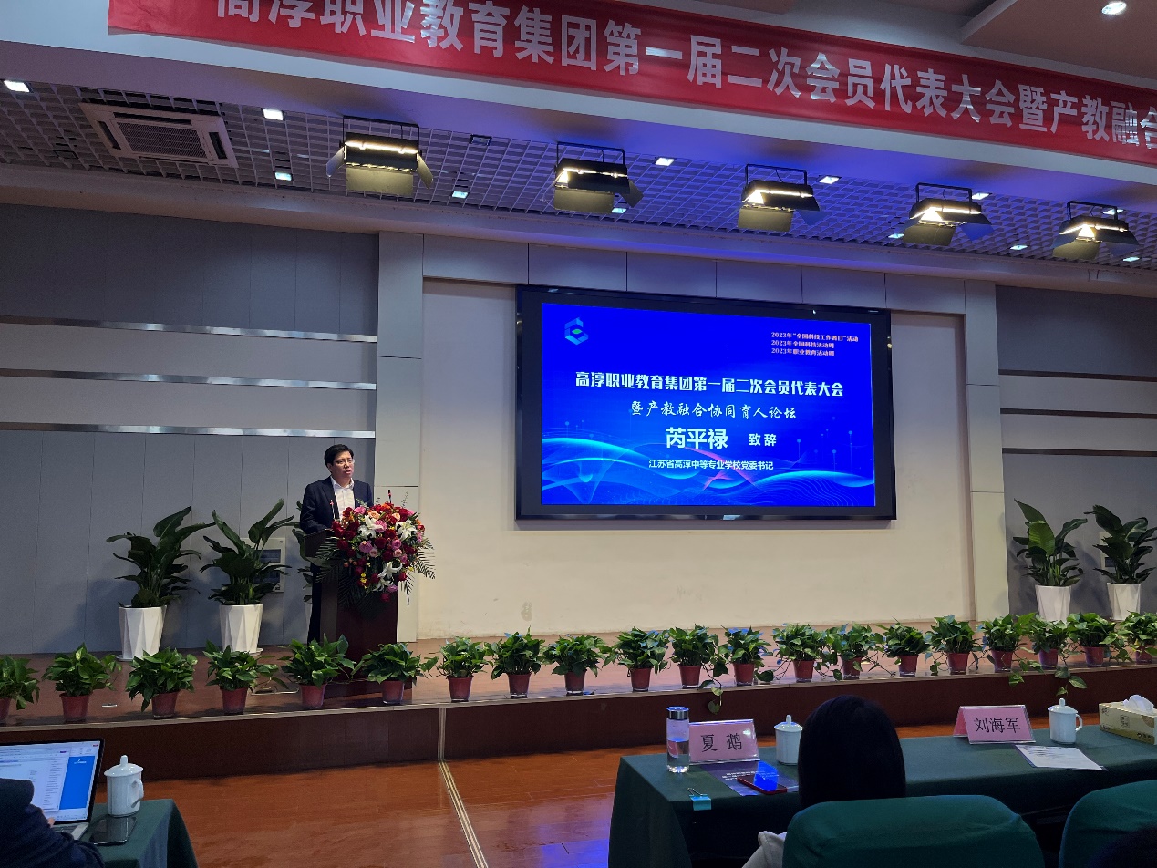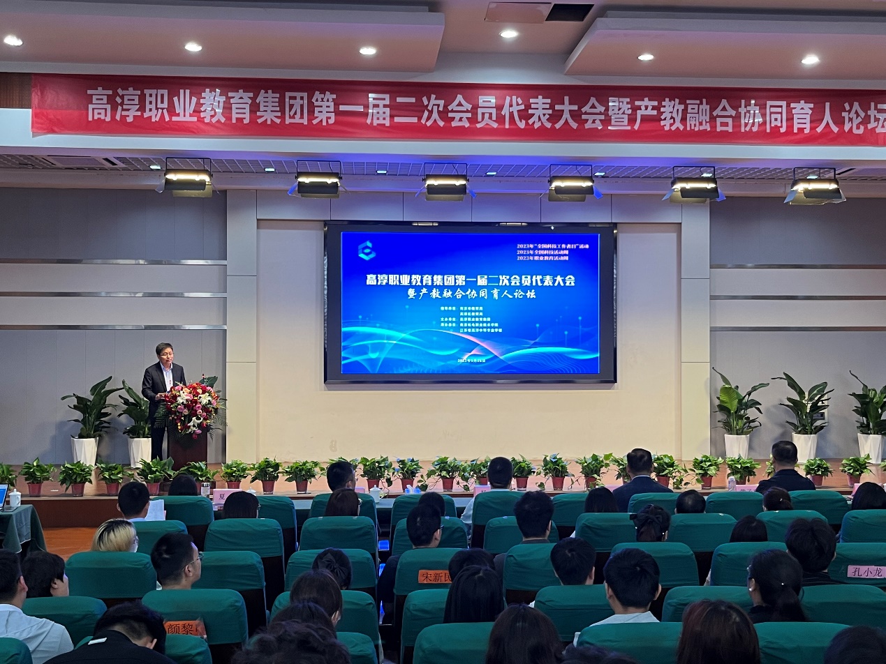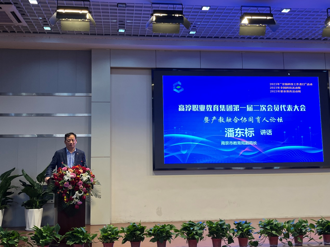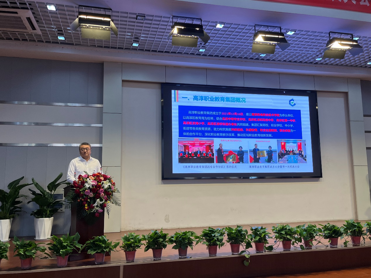 南京市教育局副局长潘东标认为高淳职教集团是高淳各界纵向贯通、横向融通的生动实践。集团化办学既是深化产教融合、校企合作,激发职业教育办学活力,促进优质资源开发共享的重要举措,也是提升治理能力,完善职业院校治理结构,健全政府职业教育科学决策机制的有效途径,更是服务经济发展方式转变、促进技术技能积累与创新,同步推进职业教育与经济社会发展的有力支撑。潘东标希望高淳职教集团成员牢记习近平总书记对职业教育高质量发展的嘱托,同心同向,理念共鸣,整合资源,挺膺担当,探索集团化办学新模式,创新集团治理结构和运行机制,全面增强高淳职业教育集团化办学的服务能力。