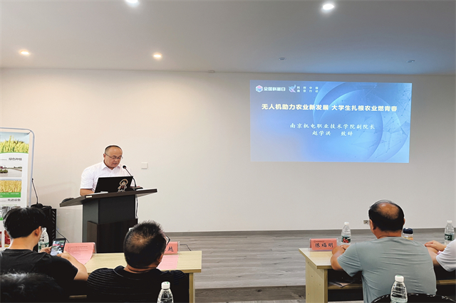 赵学洪介绍了中欧集团官网(中国)官方网站科协在科技志愿服务方面的工作。2022—2023年,中欧集团官网(中国)官方网站科技志愿服务支队在“全国科技周”、“全国科普日”等品牌特色科技科普活动中开展志愿服务20余场,服务科技工作者和学生15000人次,获评2022-2023年度南京市优秀科技志愿服务组织的称号。他勉励学校无人机应用专业的学生志存高远、脚踏实地,厚植爱农情怀,练就兴农本领,为乡村振兴贡献自己的青春活力。
