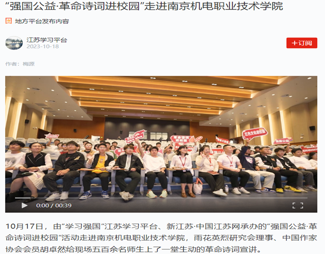 近日,“学习强国”江苏学习平台对我校革命诗词进校园活动进行了报道,全文如下: