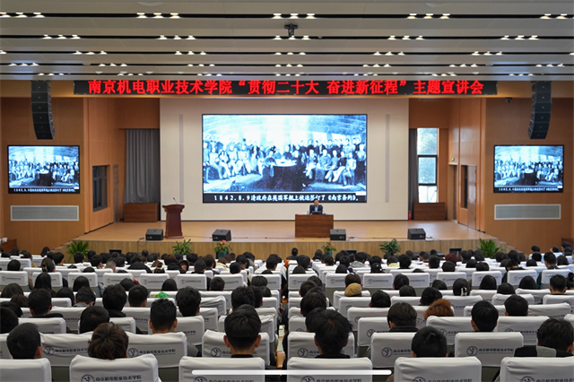 会议邀请到江苏省委宣讲团成员、南京航空航天大学马克思主义学院院长、教授、博士生导师王智以《在新征程上全面推进中国式现代化——深入学习贯彻党的二十大精神》为题作主题宣讲。王教授从中国式现代化与全面推进中华民族伟大复兴的历史进程、在新时代历史性成就和历史性变革中开启新征程等四个方面系统梳理了中国式现代化的科学内涵、鲜明特色、本质要求和前进道路上必须牢牢把握的重大原则,同时全面对标对表党的二十大作出的战略部署和安排,为我校师生深入解读了习近平总书记为江苏擘画的建设“强富美高”新江苏的宏伟蓝图。