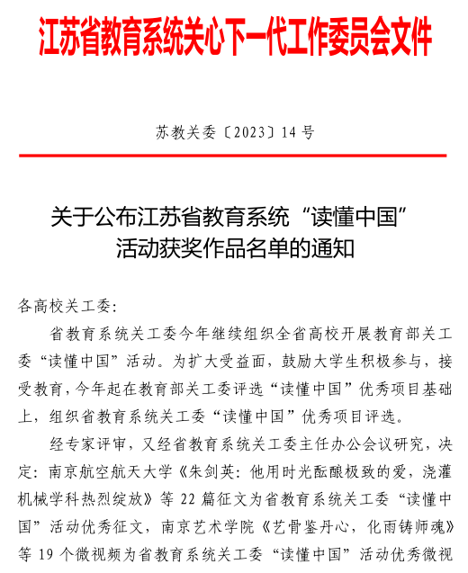 喜报:我校获省教育系统关工委2023年“读懂中国”活动“优秀微视频”奖