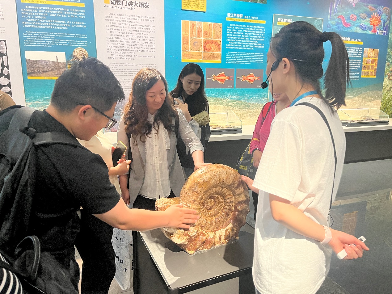 在讲解员的带领下,学校科技工作者们在生物进化主题展了解进化中的生命、演变中的地球,在生物进化专题展了解澄江动物群、恐龙、微观世界、生物登陆、无脊椎动物、南京地史演变、南京直立人等知识。科技工作者们认真聆听讲解员的介绍,感受地球和生命的沧桑巨变,在触摸菊石中,感受体验科学的乐趣。