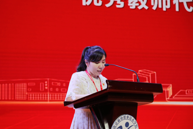 学生代表刘哲凯同学代表全校学生,满含深情向老师们送上了节日祝福,感谢师恩。优秀教师代表卢彬同志作表态发言,她阐述了自己对于习近平总书记“四有好老师”标准的认识,同时分享了自己对积极应对教育数字化转型、聚焦职教“五金”建设的思考。