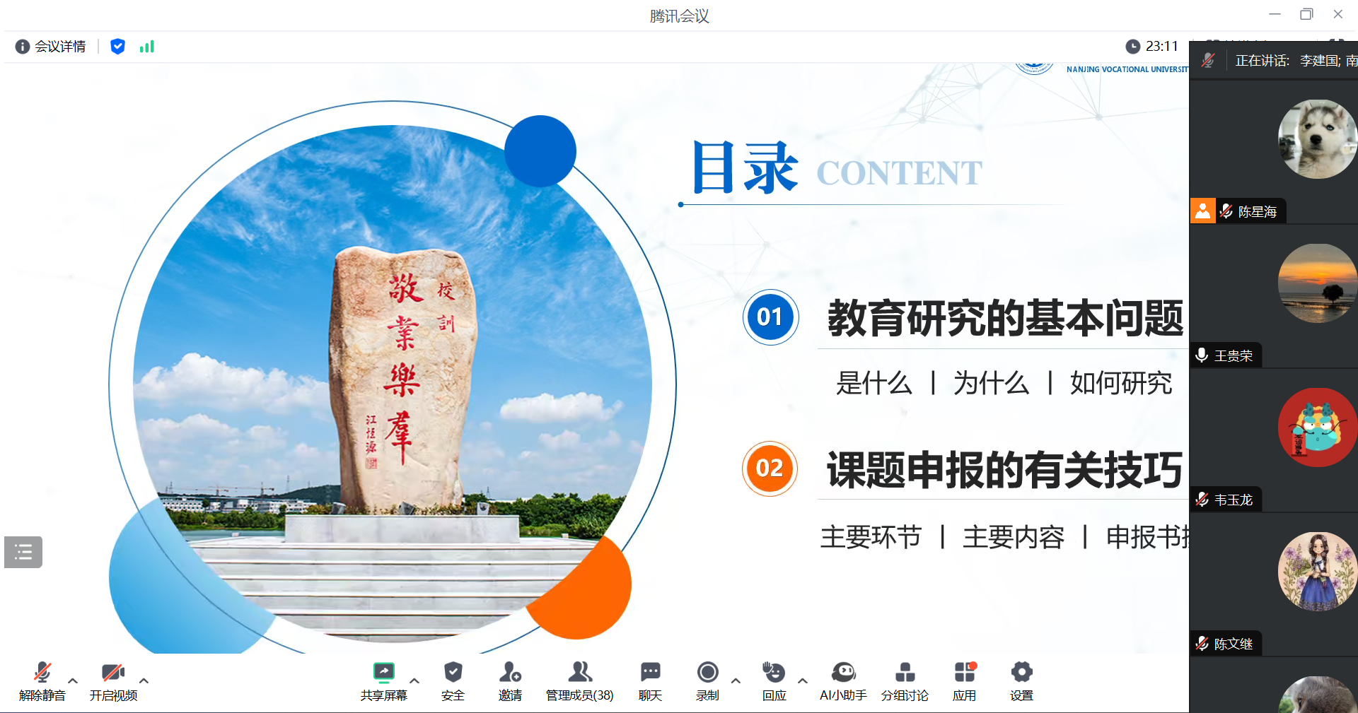讲座上,李建国结合实际工作经历,从是什么、为什么、如何研究三个方面回答了教育研究的基本问题,并结合真实案例围绕主要环节、主要内容、申报书撰写等方面深入浅出地讲解了课题申报的有关技巧。 随后,李建国还通过分享批改过的项目申报书进一步有针对性地剖析了申报书每一部分的撰写要点和注意事项。