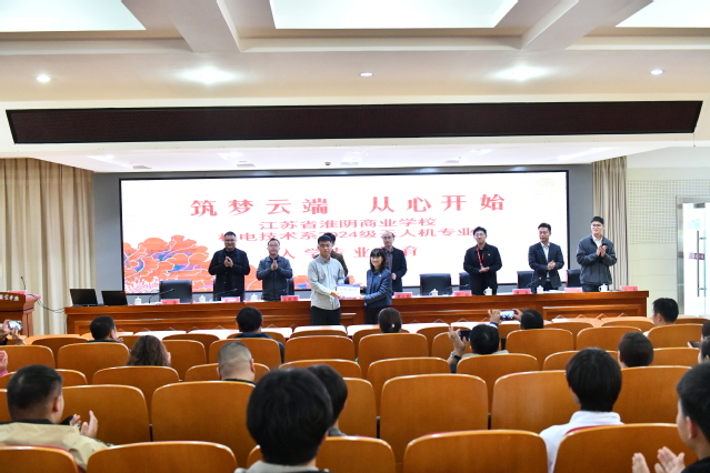 在主会场内,胡枫郑重地为江苏省淮阴商业学校24级无人机班授予了班牌,这一庄严仪式不仅标志着同学们正式踏上了全新的学习旅程,也象征着两校在深化专业建设、优化人才培养方面迈出了坚实而有力的一步。