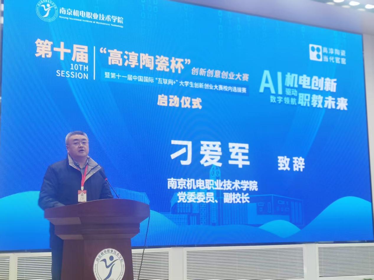 刁爱军在致辞中介绍了往届创新创意创业大赛中全校师生取得的丰硕成果。十年来,20000 余人次师生在创新创意创业大赛的舞台上,共产生作品4131 件,转化为知识产权成果 680 件。大赛推荐优秀作品在“互联网 +”“挑战杯”“赢在南京” 等高级别创新创业大赛中获奖40余项,孵化 30 余创业项目,在校园内营造出浓厚的创新创业氛围,成为培养创新人才的重要平台。他表示,学校以赛为桥梁,开辟育才新航道;以赛启智慧,锻造创新领航者;以赛促融合,搭建跨界新舞台。深度融合教育与社会产业脉动,加速智能制造、数字信息等领域产学研一体化进程,紧密对接教育链、人才链与产业链、创新链,精心描绘产教、校地深度协同的全新画卷。