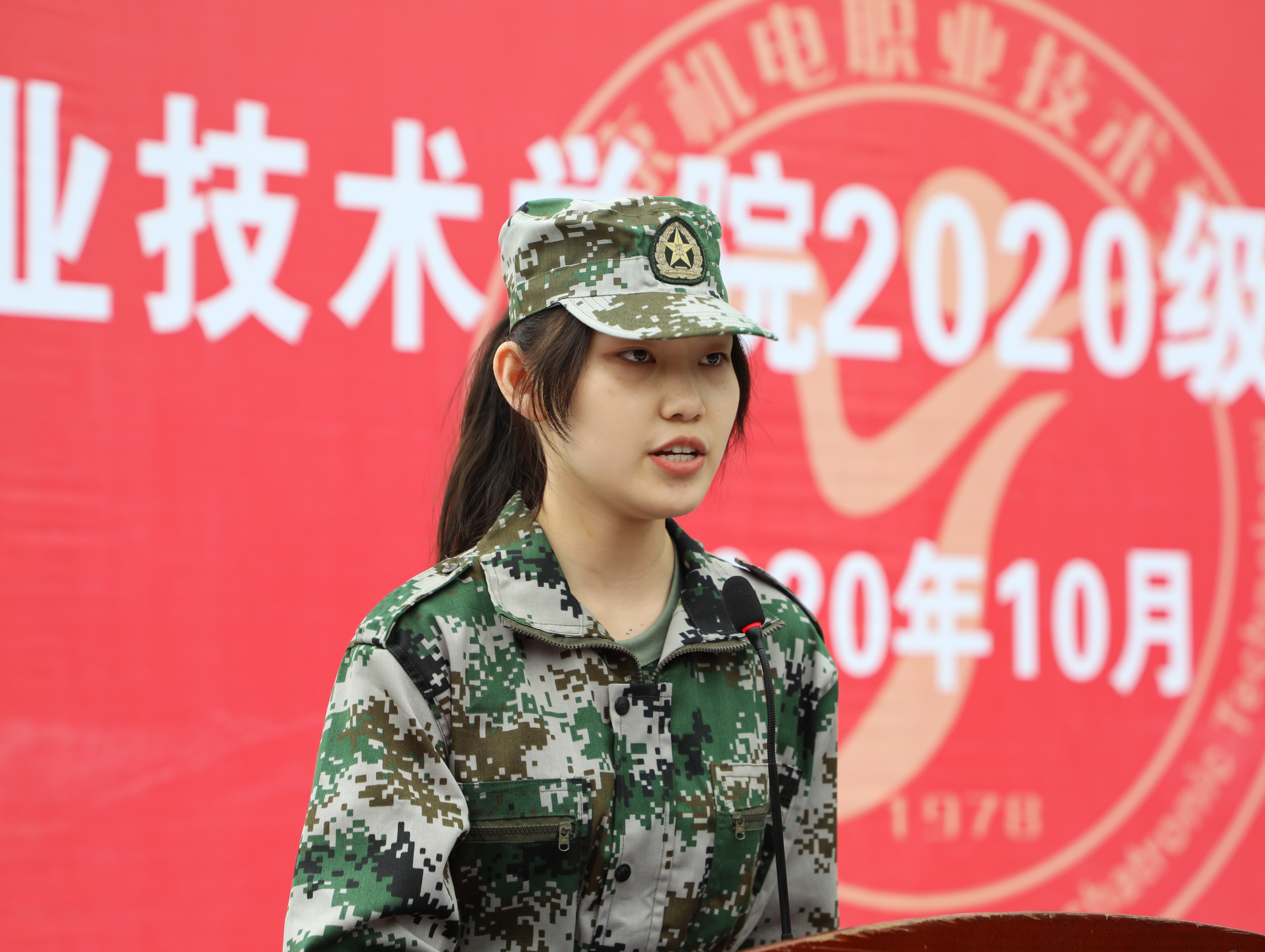 2020级人文社科系数媒201班徐珂盟同学代表新生发言。她承诺,一定会牢记父母亲人的嘱托,树立远大理想目标,在三年的大学生活中,严于律己,尊师勤学,团结协作,持之以恒,努力提高自身的综合素质,以优异的成绩回报老师、父母和社会。
