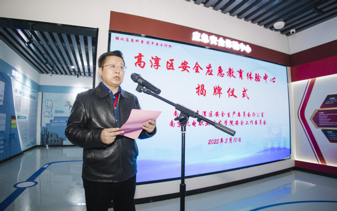 周庆礼在致辞中强调,安全是发展的生命线,应急是治理的试金石。他表示,学校安全应急教育体验中心正式由校级延展为区级,这既是对学校安全教育工作的高度认可,更是一份沉甸甸的责任。学校将以构建全链条覆盖的安全教育体系、实施全要素赋能的教育创新工程和建立全周期联动的应急响应机制三个战略定位推动安全效能提升。学校将以今天的揭牌仪式为新的起点,与高淳区携手共进、开拓创新,共同绘就人人懂避险、户户会应急、处处有保障 的平安长卷。通过校地双方的深度合作,将高淳区应急安全教育体验中心打造成长三角地区具有示范效应的安全教育标杆,为建设更高水平的平安高淳、平安南京贡献智慧和力量。