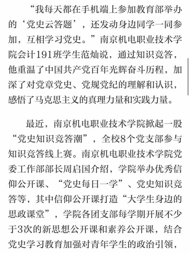 “我每天都在手机端上参加教育部举办的‘党史云答题’活动,还发动身边同学一同参加,互相学习党史。”范灿说,通过知识竞答,他重温了中国共产党百年光辉奋斗历程,加深了对党章党史、党规党纪的理解和认识,感悟到马克思主义的真理力量和实践力量。