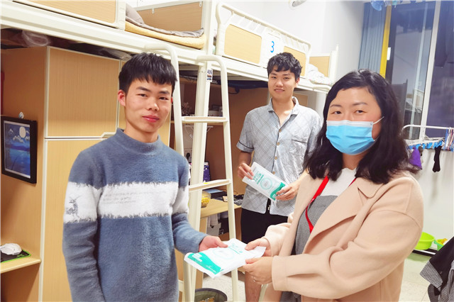“本次返岗人员的人数和名单已经上传至群里,请系部的信息员抓紧时间填写好本部门人员的返岗情况发给我们哦!”“有几位老师的苏康码、行程码不清楚,请发原图给我们!”“老师们,测温啦!”“组长,今天的晨午检人数是……”这是自学院疫情防控工作启动以来健康监测与人员管理组成员的日常工作片段。