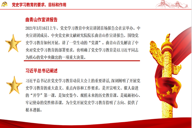曹安林以“学党史悟初心担使命”为主题,带领支部全体教职工从以下五个方面进行了深入学习:第一,明确党史学习教育的要求、目标和作用;第二,学习习近平总书记重要论述,认识党史学习教育重大意义;第三,回顾中国共产党百年奋斗的光辉历程和历史性贡献;第四,深刻把握开展党史学习教育的重点;第五,增强“四个意识”、坚定“四个自信”、做到“两个维护”。