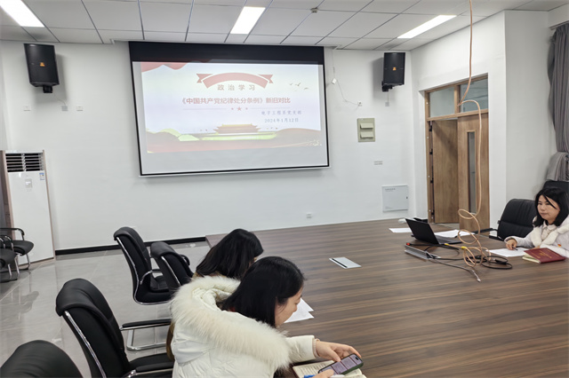 为牢固树立党员干部纪律意识,进一步深化纪律建设,以铁的纪律护航中欧集团官网(中国)官方网站高质量发展,2024年1月12日,电子工程系党支部组织专题学习2024年1月1日起实施的《中国共产党纪律处分条例》。本次学习由系党支部副书记陈雪主持,系部全体人员参加。