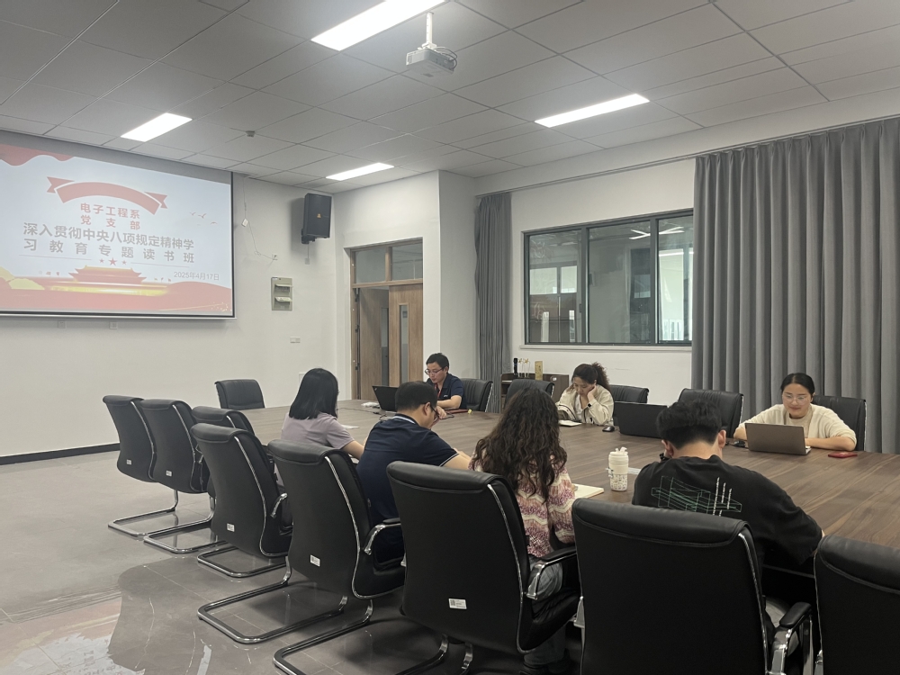 2025年4月17日,电子工程系党支部为强化党员教师作风建设,深入贯彻中央八项规定精神,于慎行楼304会议室开展了电子工程系党支部深入贯彻中央八项规定精神学习教育专题读书班学习。此次读书班内容丰富、氛围热烈,全体党员教师积极参与。