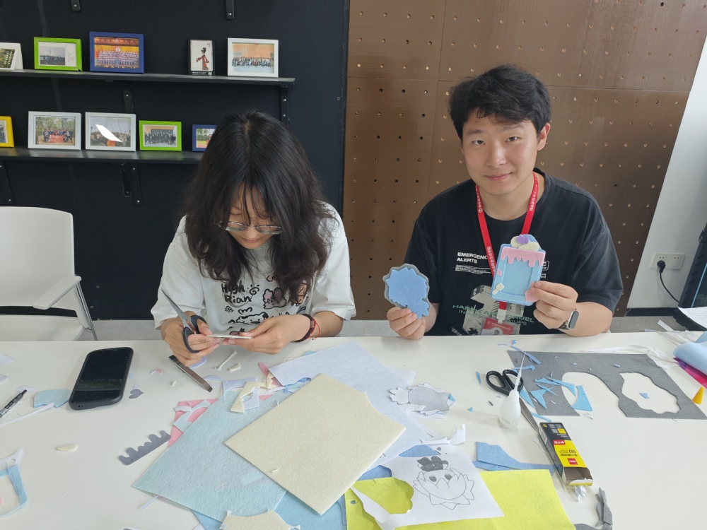 走进活动现场,温馨与创意交织,同学们围坐一堂,手中的不织布在指尖翻飞,创作灵感如泉涌,热烈的讨论声此起彼伏。心协部王晶同学化身贴心助手,帮助同学们分发材料、耐心答疑,为活动有序开展保驾护航,禹花宁老师穿梭其间,时而驻足凝视,时而轻声指导,鼓励同学们打破思维桎梏,将内心的情感与思绪倾注于作品之中,活动现场洋溢着热烈而融洽的氛围。