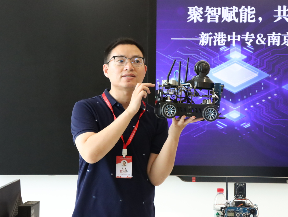 与此同时,弘毅楼307嵌入式开发实训室内,智能产品开发与应用专业负责人张晨详细解读了高职阶段“岗课赛证”融合的课程体系,重点解析了中高职课程对接、技能培养递进等关键环节。随后,智能产品开发与应用231班学生代表潘子扬结合自身经历,分享“从中职计算机基础到高职智能硬件开发”的学习进阶路径。新港中专24计算机“3+3”班学生就“技能证书衔接”“升学考试重点”等问题踊跃提问,现场形成了“学生互学、教师共研”的热烈氛围。