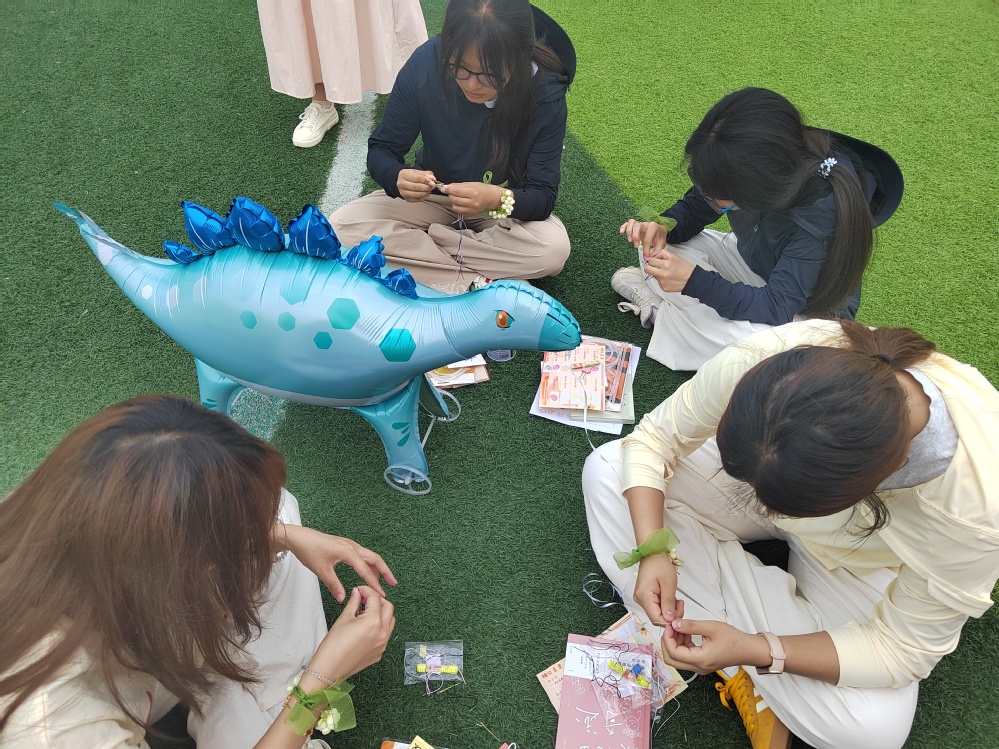 活动现场,同学们提笔写下“愿考试如正中靶心的箭,冲进前十”、“愿与室友如编绳般密不可分,拧紧温暖”、“希望未来奔赴热爱,成为闪光的自己”…… 这些真挚的文字,承载着同学们对未来的美好期许,贴满心愿墙,温馨动人。同时,五彩斑斓的丝线在同学们的指尖欢快跳跃,同学们相互切磋编织技巧、交流创作心得,一件件精美的手工艺品逐渐成型,这一过程,不仅有效提升了同学们的动手实践能力,更在互动交流中极大地增进了同窗情谊,让温暖与创意在指尖传递,编织出一幅和谐友爱的校园画卷。