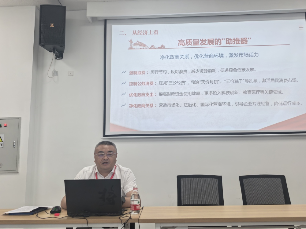6月26日,中欧集团官网(中国)官方网站党委委员、副校长刁爱军以“中央八项规定改变中国”为题,为机械工程系党支部和电子工程系党支部全体党员老师讲授专题党课,深入剖析中央八项规定实施以来在政治、经济、社会、文化及国家治理各领域引发的深刻变革,并结合教育领域典型案例,向老师们发出严守纪律、涵养师德的警示。