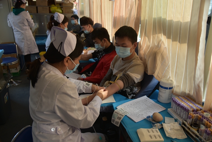 11月12日上午,在献血车到来之前,校团委的志愿者们就完成了现场的布置工作。根据疫情防控的相关要求,现场献血人员按照规定佩戴口罩、保持“一米线”。参与献血的老师和同学们按顺序填好信息、测定血型、检查身体、抽血、休息观察,在现场志愿者的帮助下,现场井然有序。