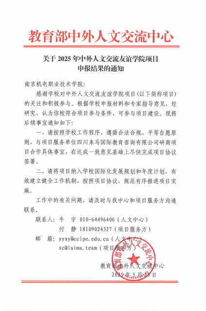 提高校国际交流与合作建设水平,积极扩大对外开放,深入实施“职教出海”,学积极开展中外人文交流友谊学院项目申报工作。近日,经教育部中外人文交流中心批准,我获批立项中外人文交流友谊学院项目。