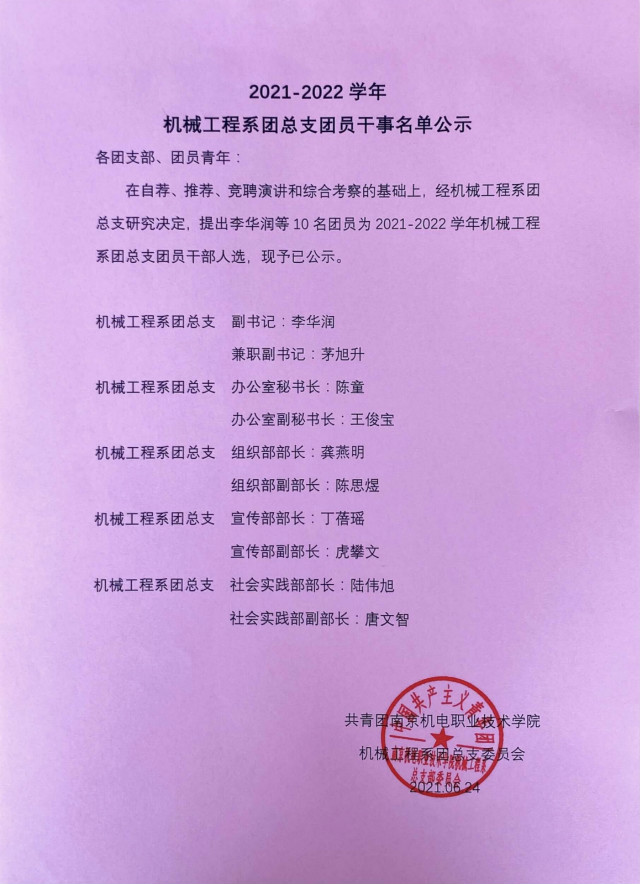 在自荐、推荐、竞聘演讲和综合考察的基础上,经机械工程系团总支研究决定,举荐出李华润等10名团员为2021-2022学年机械工程系团总支团员干部人选。