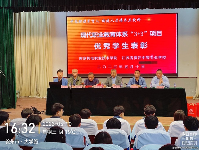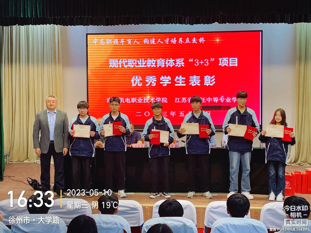 然后,杨春雷处长宣读江苏省现代职教体系“3+3”项目优秀学生的表彰决定,刁爱军院长为获奖学生颁发证书,并为江苏省贾汪中等专业学校22级机械1班和21级机械1班授项目冠名班级牌。