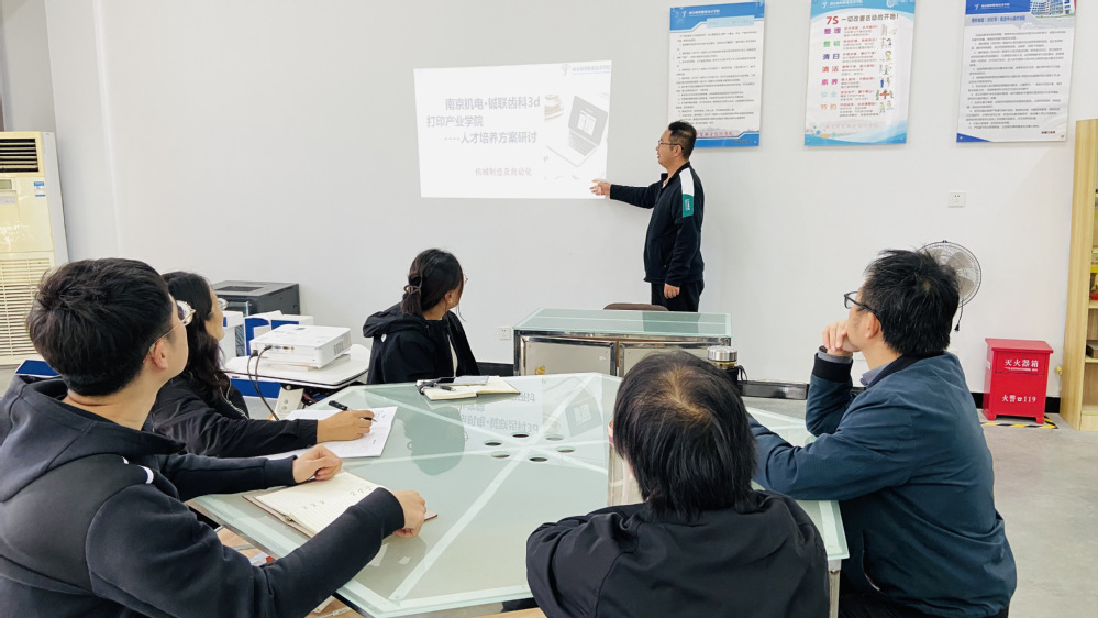 首先,徐磊详细介绍南京机电•铖联齿科3D打印产业学院项目的订单班人才培养方案。随后,他对产业学院的建设情况进行汇报。他指出,产业学院的各项教学设施正在逐步完善,未来,产业学院将继续加强与企业的合作,引入更多先进技术和设备,提升教学质量和人才培养水平。