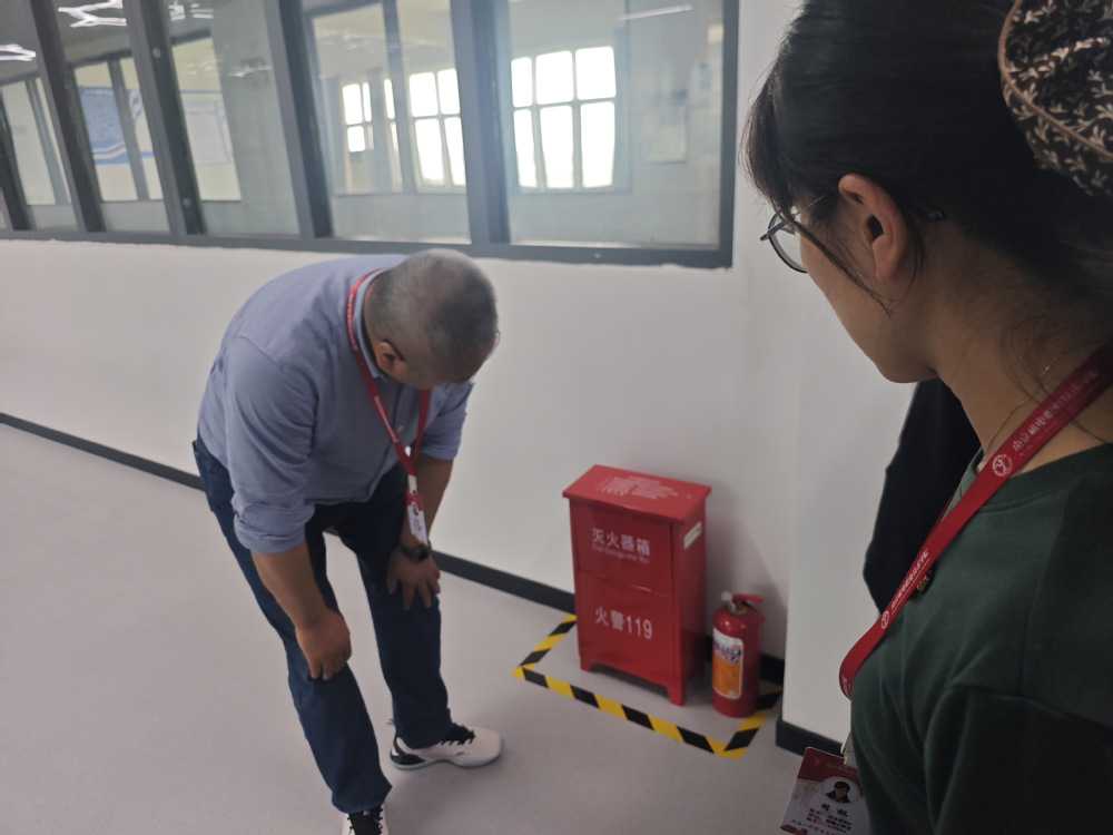 在机械加工、数控等实训室,团队老师重点核查设备断电防护与危化品管理:数控车床等设备均按规范断电并覆盖防尘罩,危化品存放柜锁具完好,台账与实物数量一致。在环境安全方面,三间实训室地面油污及时清理并增设防滑标识,一处被工具遮挡的灭火器箱也已完成整改,所有消防设施压力值均处于安全范围。