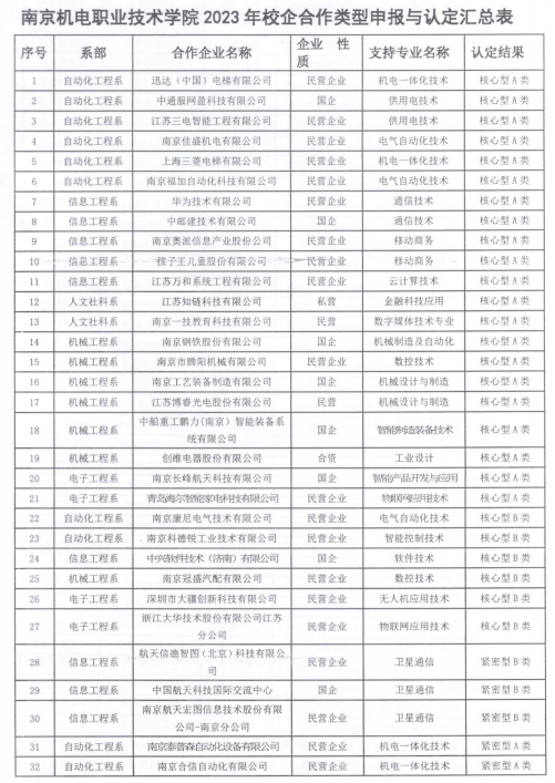 经科研及校企合作处初审、现场汇报答辩、专家评审,认定南京冠盛汽配有限公司等27家为核心型企业、认定南京福加自动化科技有限公司等16家企业为紧密型合作企业、认定南京旭上数控技术有限公司等65家为半紧密合作企业。