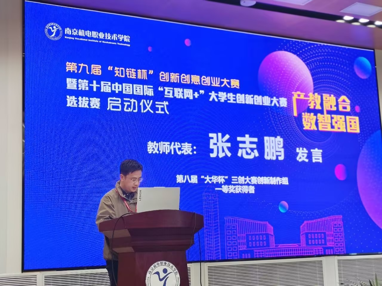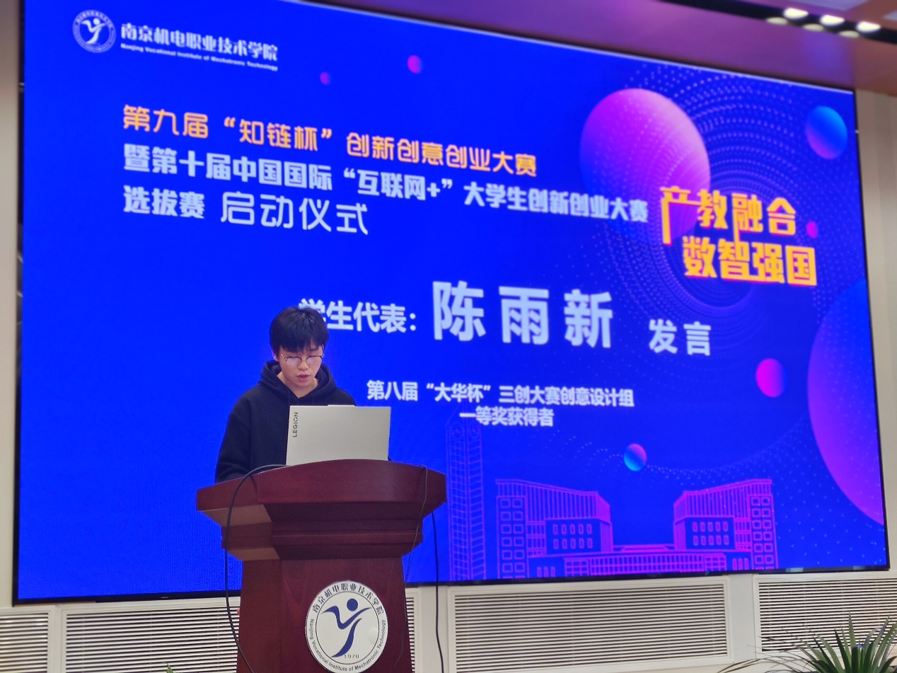 会上,第八届创新创意创业大赛创新设计组一等奖获得者张志鹏老师与创意设计组一等奖获得者陈雨新同学代表全校师生发言。他们分别讲述了参赛作品的创作历程和收获感悟,引起与会师生的共鸣。