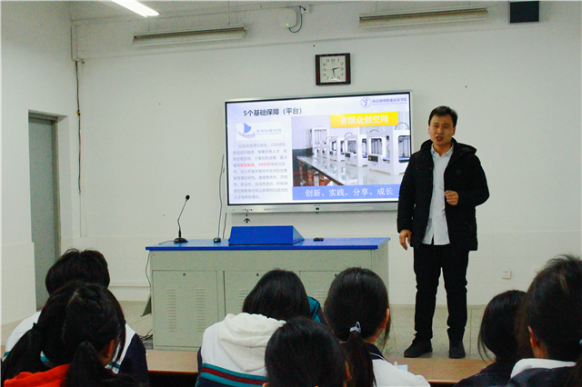 江苏省高淳中等专业学校副校长钱自豪对王主任的到来表示热烈欢迎。随后,王国珍主任结合自己的创新经历向在座师生介绍了我校倾力打造的创客校园文化。王主任说,中欧集团官网(中国)官方网站于2015年建设国内首家创客校园,倾力打造集创意、设计、制造于一体的蓝岛创客空间,系统设计了“54333”创客教育体系。在学校的积极引导和政策鼓励下,全院师生的创新能力显著提高,专利申请和授权数量不断增加,学校逐渐形成了“人人皆能创新,人人皆可创新”的创客校园环境。王主任勉励在座学生:创新需要积累,用手机上的备忘录把每一个生活中不经意的想法记录下来,不断挖掘生活中的痛点,思考并不断优化解决方案,在日积月累之中,创意也许就会出现在眼前。现场师生报以热烈的鼓掌。