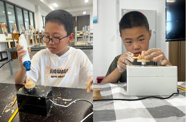 上午进行的是拉坯体验活动,蓝岛创客空间候俊老师介绍了制作的方法和重点。拉坯主要是利用拉坯机产生的离心运动,在旋转过程中,对含水半固化状态的泥料按照设计构思拉伸成型。制作过程中要注意手要稳,定好中心,不跑偏,抚底防开裂,做出形状后整体拔高,最后整理作品的细节。参加活动的教职工及其子女都热情高涨地投入到拉坯的制作中。初次制作的过程中出现了坍塌、开裂、中心跑偏等情况,但是没有人放弃,特别是小朋友们都耐心的一遍遍重头做起,不断总结失败原因,调整自己的制作过程,最终获得自己心中满意的陶艺作品。