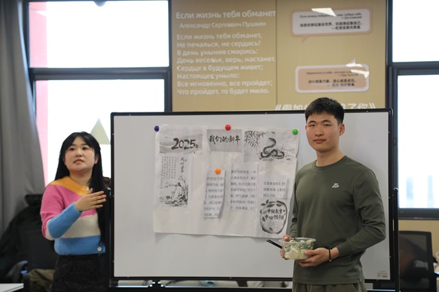 为了确保这次线上交流课堂的顺利进行,双方学校的学生都提前查阅典故、绘制海报、制作道具、录制视频等,做了充分的准备。课堂上,同学们分享了各自国家新年的由来、传统、特色食物、风俗等,并展开了热烈的讨论。值得一提的是,在活动中,我校俄语班的学生展现出了出色的语言能力和文化素养,赢得了国立社会人文大学学生的高度赞誉。