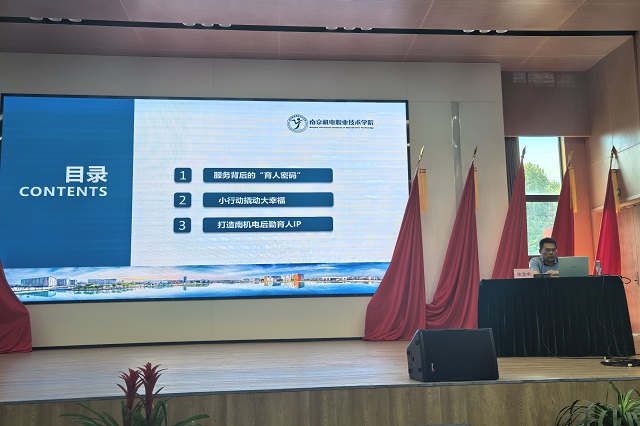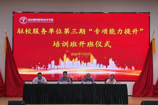 为深入贯彻新时代教育高质量发展要求,全面提升驻校服务团队专业化水平,7月2日,南京机电职业技术学院第三期驻校服务单位职业素养培训班在乐学楼报告厅正式开班。本次培训由学校培训处、后勤处、保卫处联合主办,通过系统性课程设计与多元化教学模式,全面锻造高素质校园服务队伍。校党委副书记、副校长赵学洪,继续教育学院院长兼培训处处长周云龙,后勤处处长孙永玲,保卫处处长张清松等领导出席开班仪式。
