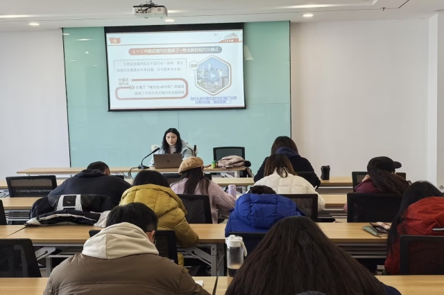 王老师围绕着“以中国式现代化全面推进中华民族伟大复兴”这一主题,分别从中华民族近代以来最伟大的梦想、中国式现代化的中国特色和本质要求等内容进行深入的阐述。她指出,中国式现代化是我们党领导全国各族人民在长期探索和实践中历经千辛万苦、付出巨大代价取得的重大成果,必须倍加珍惜、始终坚持、不断拓展和深化。以中国式现代化全面推进中华民族伟大复兴是一次新的长征,前途光明,任重道远。必须大力弘扬团结奋斗精神,奋力以中国式现代化全面推进中华民族伟大复兴。