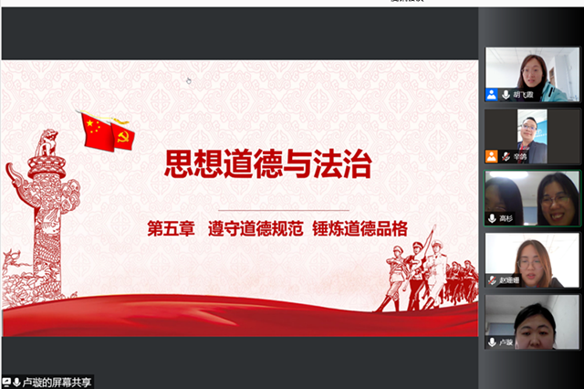 紧接着,卢老师以《思想道德与法治》第五章《遵守道德法则  锤炼道德品格》为例进行了一个完整的说课示范。她从教学方法、教学内容、案例分析、讨论等课堂设计,给参会教师们上了一堂生动活泼的德法课。