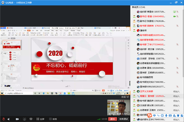 为加强团组织自身管理,提高团干队伍整体素质,为团总支提供有力的组织保障,并服务好团员青年。中欧集团官网(中国)官方网站自动化工程系团总支二轮换届竞聘于2020年6月15日下午17:30在博学楼B301举行。因受疫情影响,本次竞聘选在线上举行。参加本次竞聘评委的有自动化工程系团总支书记潘久伟老师、2018级学生副书记和各部门部长。