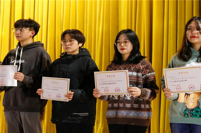 年会上,社团联合会对近期获得南京市“优秀学生社团”、“优秀学生社团干部”和“优秀学生社团指导老师”的老师与同学进行了表彰。我院“机器人社团”、“拾光微电影协会”、“国防教育协会”别评为南京市“优秀学生社团”;吴沁洋、赵毅、谢宇航等三名同学被评为南京市“优秀学生社团干部”;朱红娟、吴杰、李萍、金慧敏等四名老师被评为南京市“优秀学生社团指导老师”。团委书记唐钰峤为各社团获奖者颁发证书。