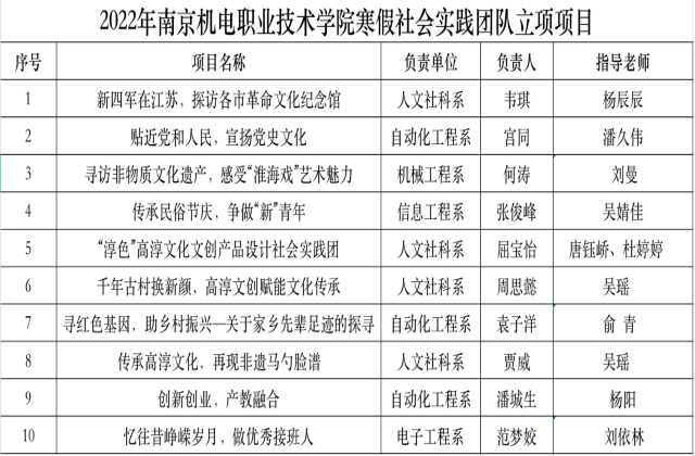 为深入学习贯彻习近平总书记在庆祝中国共产党成立100周年大会的重要讲话精神,进一步推动爱国主义教育与实践育人工作深度融合,引导机电学子以强国一代新青年的良好精神面貌迎接党的二十大胜利召开,庆祝中国共产主义青年团成立100周年。团委决定开展“小我融入大我,青春献给祖国”2022年中欧集团官网(中国)官方网站大学生寒假社会实践活动。经自主申报,各团总支、青马班审核推荐,校级专家评审,确定以下10个项目为2022年中欧集团官网(中国)官方网站寒假社会实践团队立项项目,并对立项的项目给予经费支持,现公示如下: