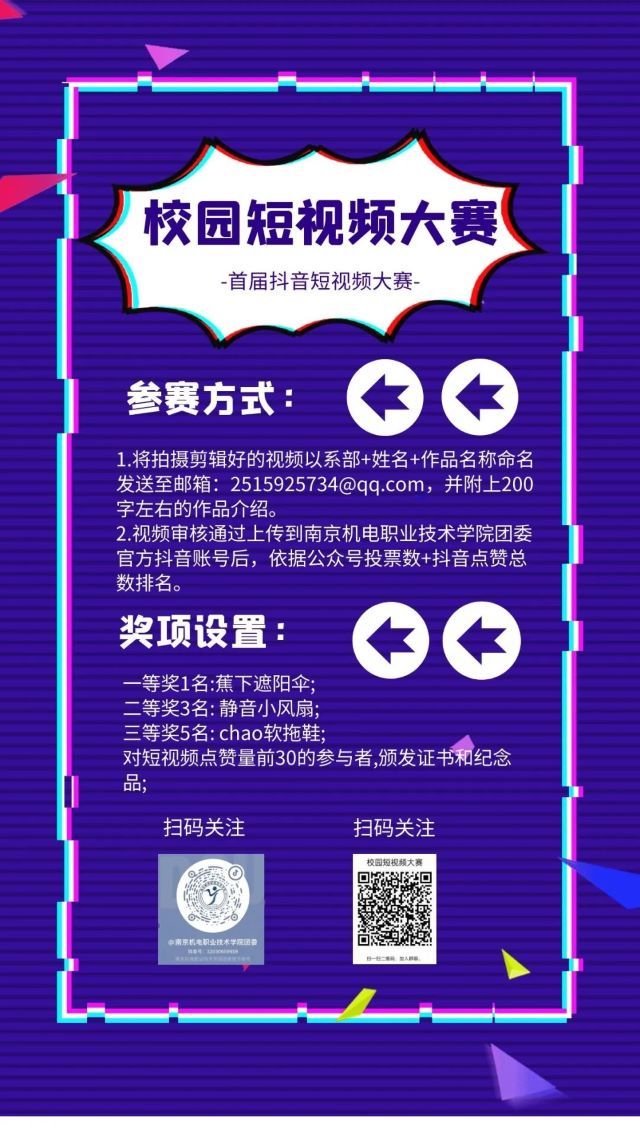 本次校园短视频创作大赛由我校团委举办,全体在校学生均可参与。视频题材可以是积极正能量的校园趣事、防疫视频、小短剧等,内容不限。什么?你问一个人怎么拍小短剧?没有关系!因为本次比赛不仅可以单人参赛,还可以组队参赛。参赛者不仅可以获得奖状,获奖者还可以得到小奖品哦。花花视频迷人眼,你的视频最亮眼~还在等啥,积极参加校园短视频创作大赛吧,冠军在等你来夺!