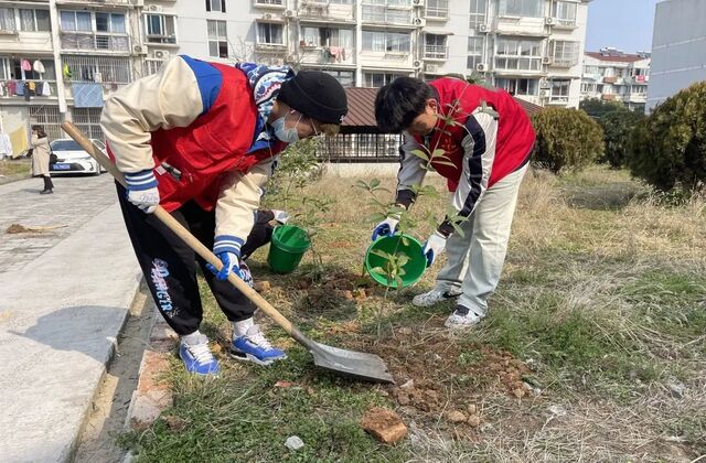 此次的志愿服务活动共分为三个部分,分别是环境整治,关爱孤寡老人和公益植树。全体志愿者分为三组,在分别领到工具后,各自展开了活动。第一组是植树组,同学们带着水桶、铁锹和锄头,将小树苗种植在花园里,同学们不怕累,不怕脏,小心翼翼地呵护着幼苗。
