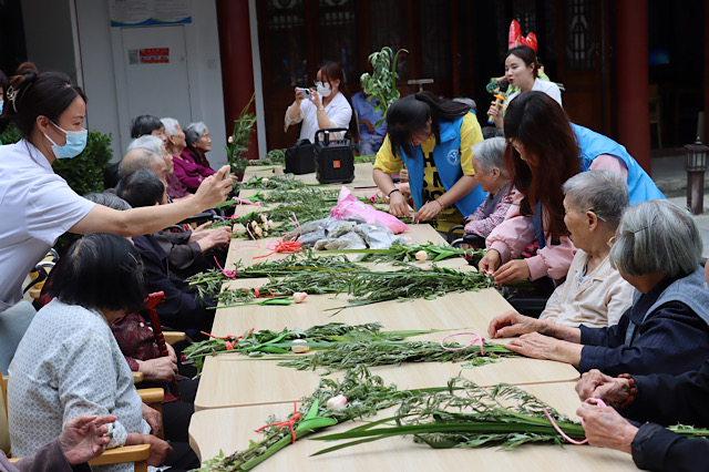 活动前期信息工程系团委书记沈歆岩及自动化系团委书记周笛共同本次敬老院活动流程进行讲解随后便带领志愿者们摆放桌椅以便老人们入座。志愿者们在负责人的调动下分工明确,有的在摆放桌椅,以便老人更好的落座有的在收拾艾草,有的在挑选花朵,有的在准备编织的绳子。随着准备工作的逐步落实,活动也就此展开,志愿者们为老人分发艾草、粽叶、荷花,与老人共同编织象征端午节"吉利"的花束,志愿者一边与老人共同编织花束一边交流着端午节的习俗和故事,他们的到来为平日里稍显安静的护理院增添了许多欢声笑语。同时,志愿者与老人们亲切交谈,了解他们的日常生活和健康状况,并为他们送上精心准备的节日礼物