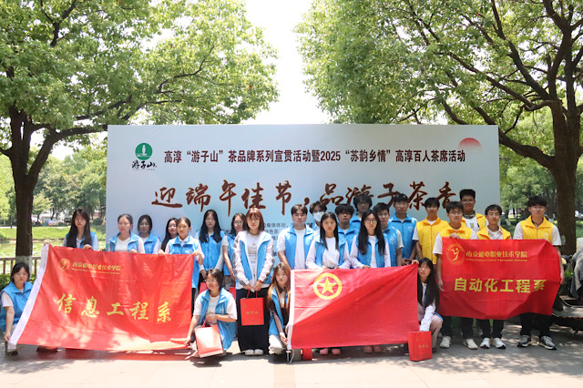 5月30日的清晨,高淳宝塔街道泮湖公园内茶叶展销会现场茶香弥漫,一场融合传统茶文化与公益精神的盛会在此拉开帷幕。学校信息工程系团委携手自动化工程系团委受学校劳动实践基地青茶空间的邀请,组织30名学生志愿者为此次活动贡献了来自南机电的公益力量。
