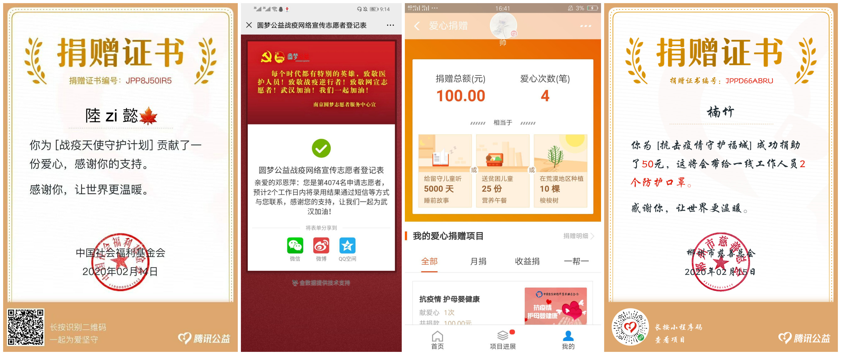 英雄在坚守,国家在努力,同学们也在力所能及的做出自己的奉献。来自通运181的姚栋超同学已经在李口社区的马路边上当了三天的志愿者了,他感觉自己身为一个大学生可以为社区在疫情里做出自己的贡献,也坚信能战胜这次的新冠肺炎病毒。同样的还有软件191的陈炯和软件181的赵慧,她们也都在为自己所在的社区做着志愿者活动,积极参与了防控知识宣传及普及工作。还有软件技术193的黄周恬、邓恩萍,移商182的杨成霜,移商193的赵晨、朱思楠、赵亚慧,她们都是圆梦公益志愿团队的网络志愿者,他们有明确的分组,每天也有明确的任务,她们都认为这是一次非常有意义的活动,也加深了自信面对病毒防疫的认识,能为祖国的疫情出一份力,就会感觉到无比快乐。有用实际行动来做贡献的,也有通过捐献爱心来表达自己对疫情的关心。移商192的陆子懿、董路,软件192的谭泽宇、陈鹏、林晓杰欸,云计算191的孙嘉伟、韦亚如、顾梦瑶、施淼、葛志伟、刘源,移商191钟成杰等同学都通过捐款的形式积极支援武汉疫情。